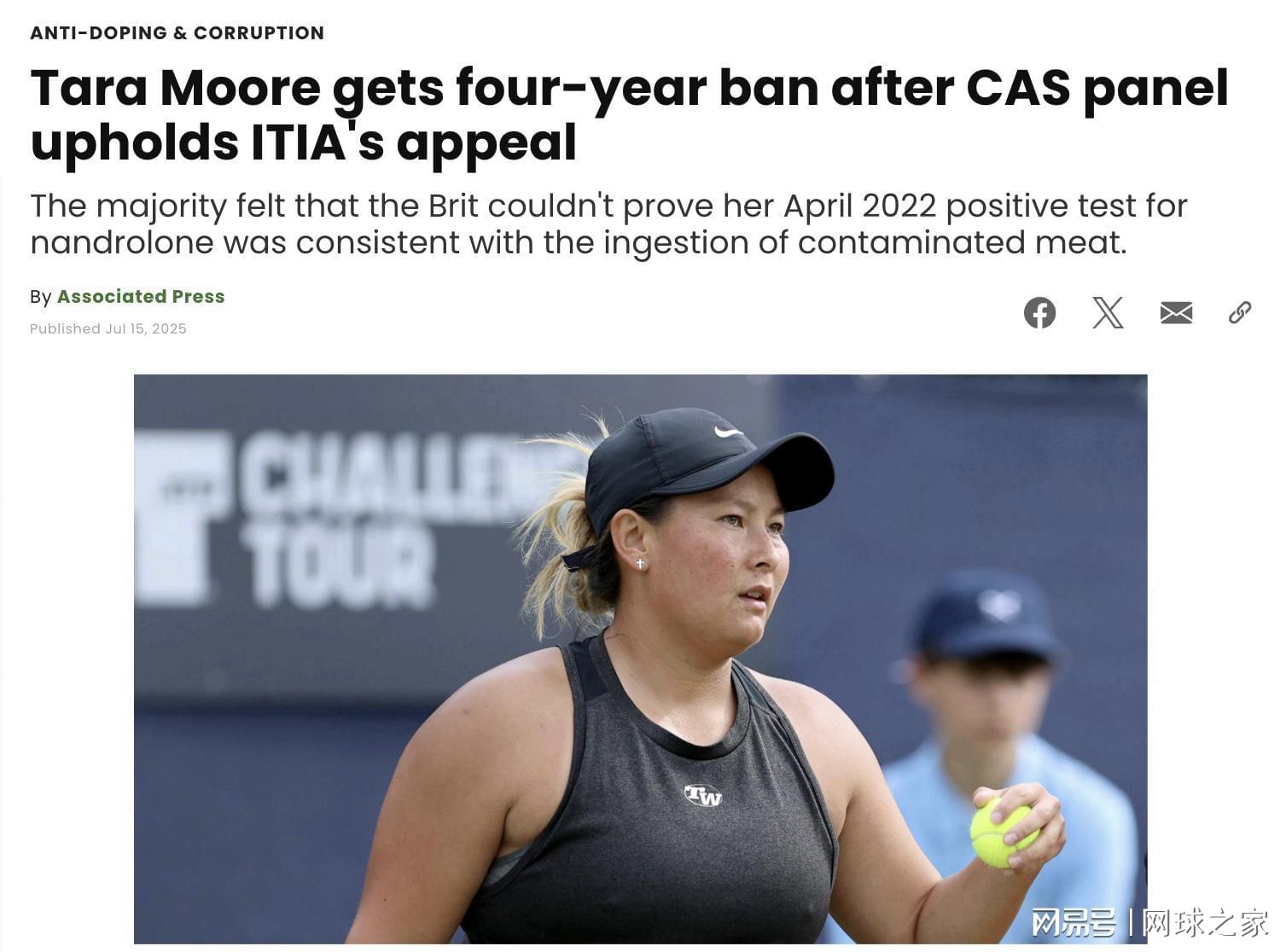 然而,国际网球诚信机构(ITIA)对此判决提出上诉。2025年7月,国际体育仲裁法庭作出了颠覆性的改判:摩尔被禁赛四年,扣除已执行的19个月临时禁赛期后,她最早要到2028年才能重返赛场。CAS在声明中指出,摩尔未能证明样本中兴奋剂浓度与食用污染肉类的情况相符,且无法证实此次违规“非故意”。